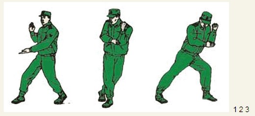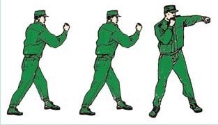 动作要领:进步左直拳,接右摆拳,接左色拳(不收回)两眼目视前方。如下图: