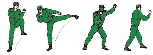 动作要领:左直拳,接右直拳,接右横踢,右脚落步,出左直拳(不收回),右拳置于下颌,两眼目视前方。如下图: