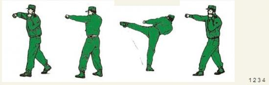 动作要领:右摆拳,接左直拳,接左侧踹,左脚落步,出右直拳(不收回),两眼目视前方。如下图: