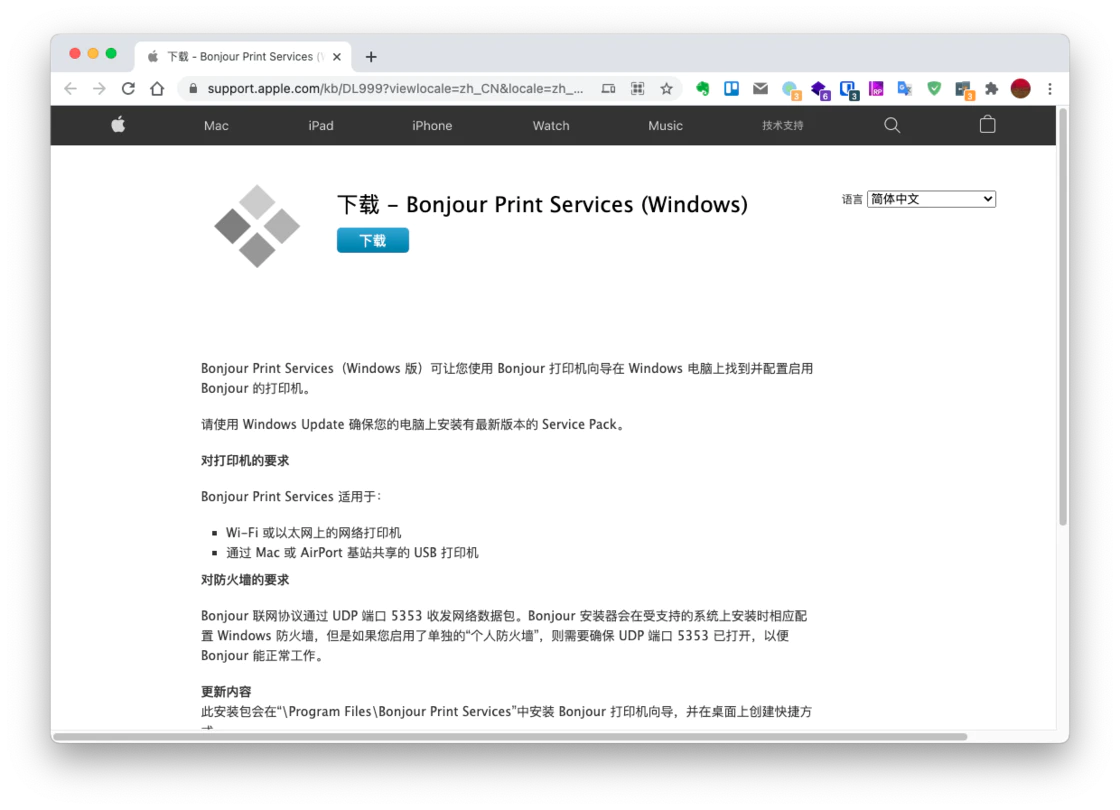 我们需要在 Windows 上安装 Bonjour Print Services (Windows ) https://support.apple.com/zh-cn/106380 ,