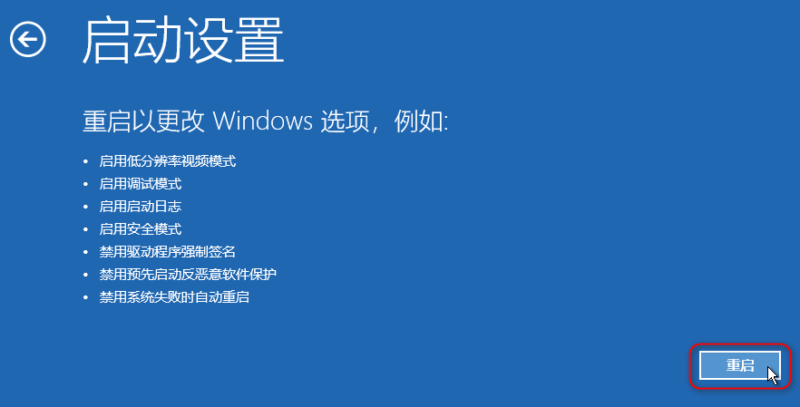 6、在“启动设置”中,点击“重启”,重新启动电脑;