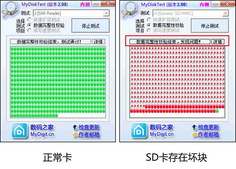 对于通过MyDiskTest检测出异常的SD卡,为了监控数据安全和正常使用,建议勿用于监控存储,请更换正常的SD卡。