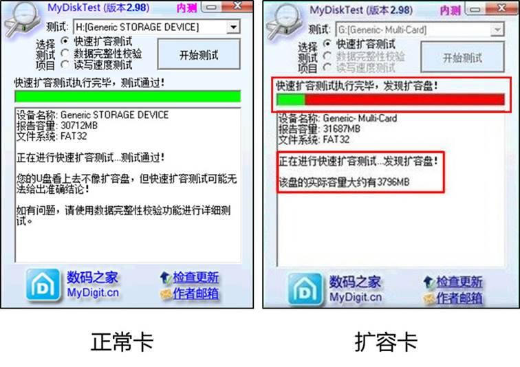 扩容测试结果比较直观,当检测出SD卡为扩容卡时,会有文字提示和红色进度条表明该SD卡是一张扩容卡;如果是非扩容卡,则文字提示测试通过