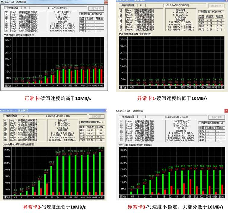 读写速度测试主要测试SD卡的实际读写速度是否满足Class10/U1等级,正常SD卡的特征是:1、随横坐标块容量递增逐步递增,读写速度最后趋于稳定;2、读写速度稳定值在10MB/s即以上。其他异常SD卡存在速写速度不达标的情况,具体见下图所示。